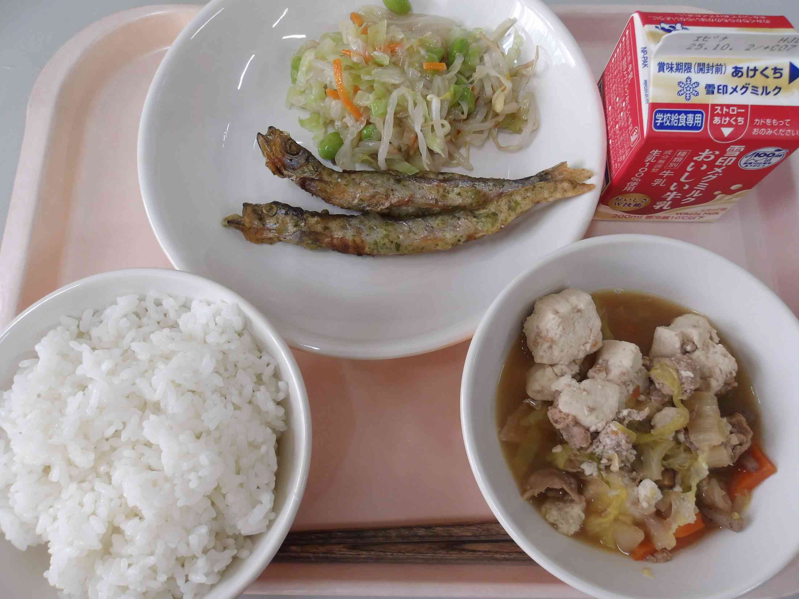 ごはん、ししゃものいそべあげ、えだまめサラダ、にくどうふ、ぎゅうにゅう 今日の主菜は「ししゃもの磯辺揚げ」です。ししゃもに青のりが入った衣をつけて、油で揚げました。ししゃもは骨ごと食べられるので、カルシウムがたくさんとれます。 【児童の感想】 ししゃものほねがいっぱいあったけどおいしかった。
