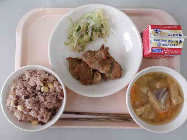 つなひきよいしょ、とりにくのごまやき、グリーンサラダ、じゃがいものみそしる、ぎゅうにゅう つなひきよいしょは、熊本県山鹿(やまが)市の民話「不動岩と権現山(ごんげんやま)のつなひき物語」から生まれた料理です。おいしい小豆を食べて育った不動岩と、硬い大豆を食べて育った権現山のお話で、この話から大豆と小豆を使った混ぜごはんが生まれたそうです。 【児童の感想】 きゅうしょくありがとうございます。 きょうのとりにくのごまやきがとてもおいしかったです。グリーンサラダもきょうのきゅうしょくぜんぶおいしかったです。まただしてください。まってます。【添付ファイル】