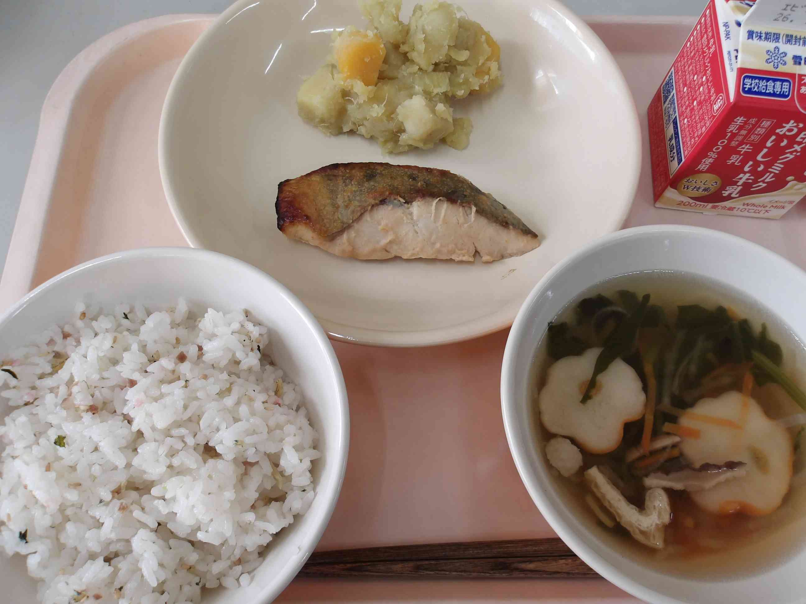 うめちりごはん、メダイのさいきょうやき はなふいりさわにわん、くりいりきんとん、ぎゅうにゅう おせち料理には、1つ1つの料理に様々な願いが込められていて、栗きんとんには「お金持ちになりますように」という願いがこめられています。 【児童の感想】 スープがおいしすぎてすぐなくなった。 ごはんもいろいろな、ぐざいがあっておいしかった。 くりきんとんがおいしすぎた。