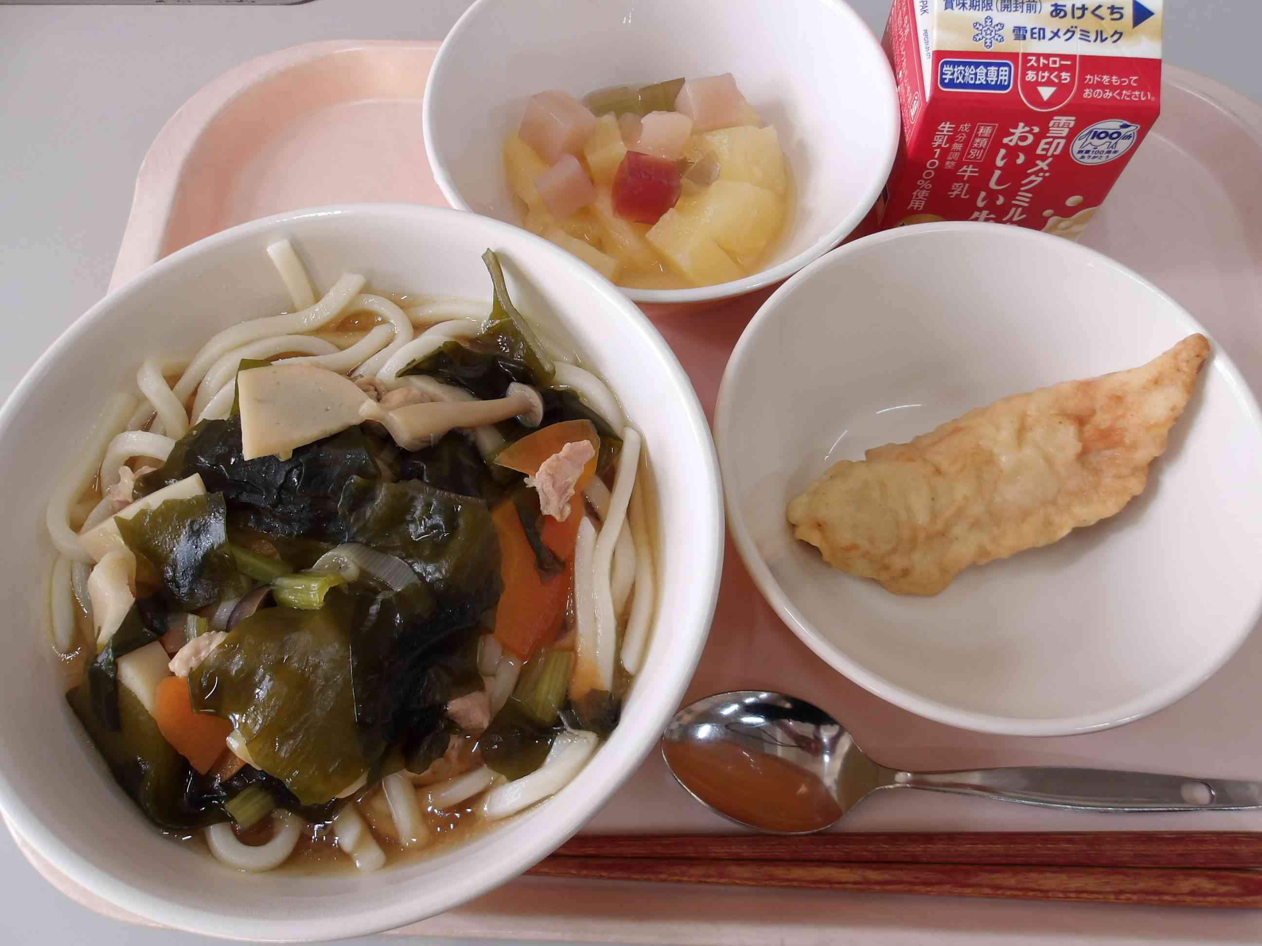 わかめうどん、かしわてん フルーツポンチ、ぎゅうにゅう 今日は、給食センターに職場体験に来た四中のみなさんが考えた献立です。 人気のわかめと旬の野菜を合わせた温かくおいしいメニューを 考えたそうです。 おいしくできあがりました。 【児童の感想】 今日はとてもかしわ天がおいしくてほっぺがおちそうでした。 それにきょうのフルーツポンチがあまくておいしかったです。 今日のきゅうしょくはかみでさいきょうのきゅうしょくでした これからもよろしくおねがいします。【添付ファイル】